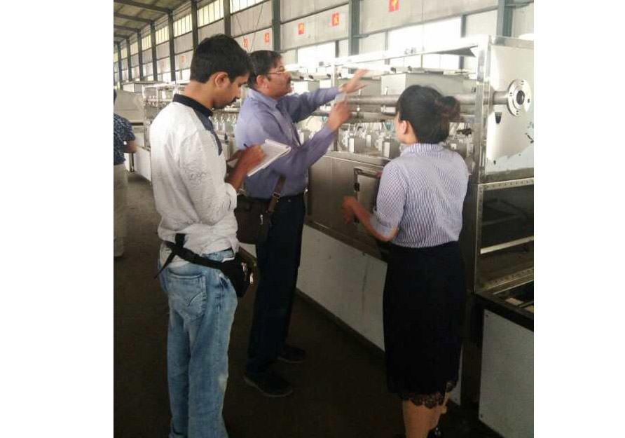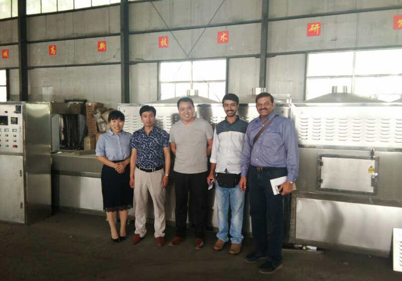 印度客戶在阿達森機械工廠參觀考察微波花生烘焙設備